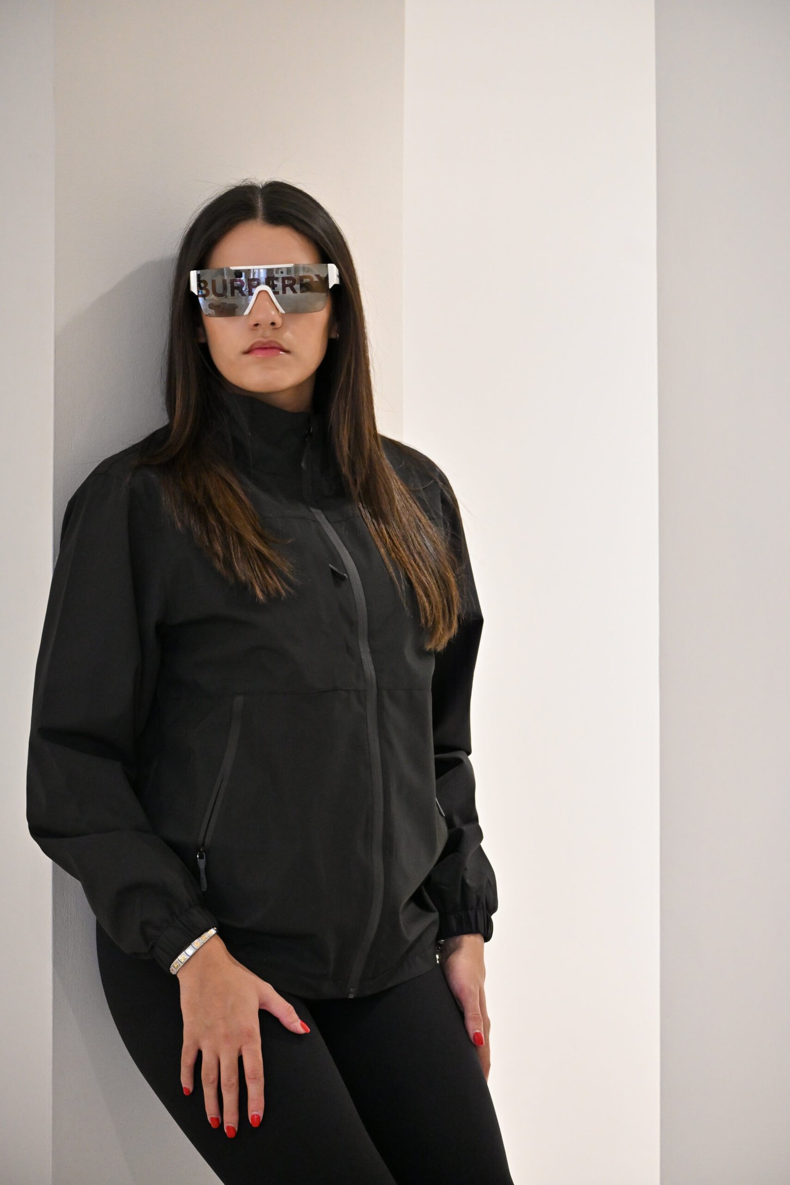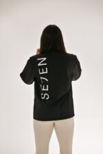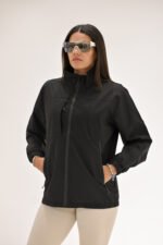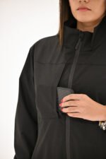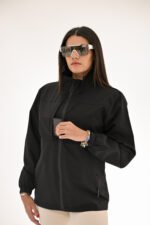 A Sleek black coat with a zip-up front and long sleeves.  Features two handy pockets for your essentials,  perfect for casual outings or active days in chillier mornings or evenings.  Stylish, practical and versatile.  The Noir Sportif Coat is a wardrobe Must-Have.